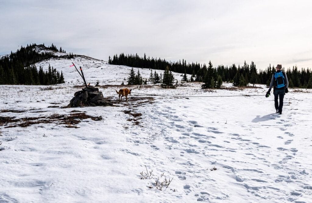 We passed a large cairn – and you could climb to the summit from here and shave off a bit of distance. Instead, we continued to the next junction. From there, heading uphill is the clear route to the Jumpingpound summit, just a short 5–7 minute hike over 320 metres.
