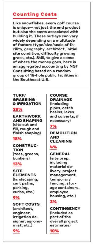 What drives up the cost? Features, mainly. “Bunkering, water features and landscaping,” says Curley. “Those are the three line items where an owner might say, ‘Oh, no, I just need a basic thing.’ Otherwise, irrigation is irrigation, cart paths are cart paths, grass is grass.”