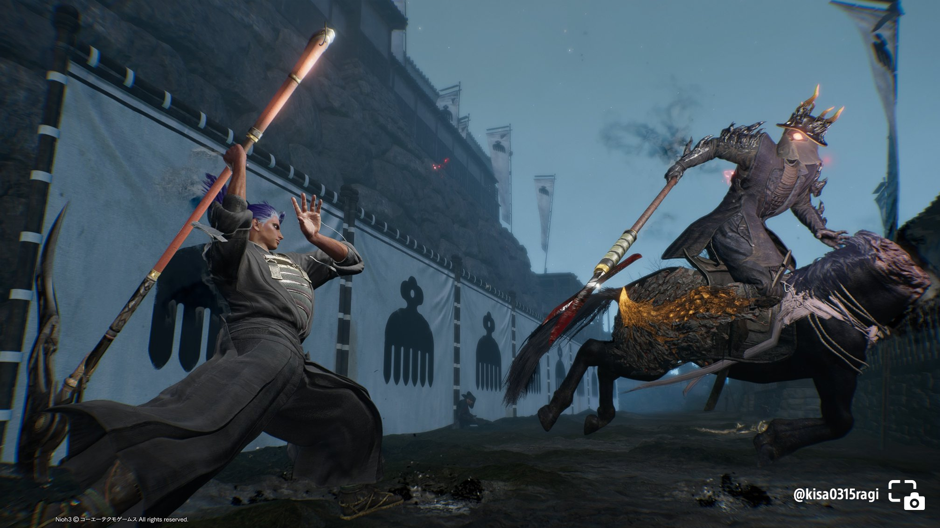 kisa0315ragi shares their character reeling back to attack an enemy on horse