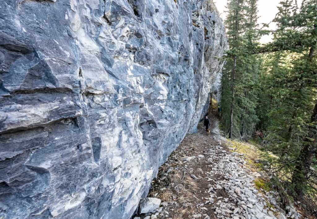 Otherwise, head off into the woods on a good trail. It’s about 1.3 km down to meet up with the Prairie Creek trail. Most of it is very steep – but also beautiful with all the white-grey rock and fun to hike. The crag is surprisingly long. There were several occasions where John and I thought we were at the end of it, only to see it continue.